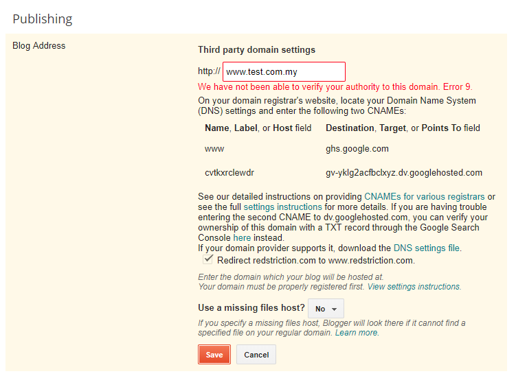 blogger unable to set custom domain