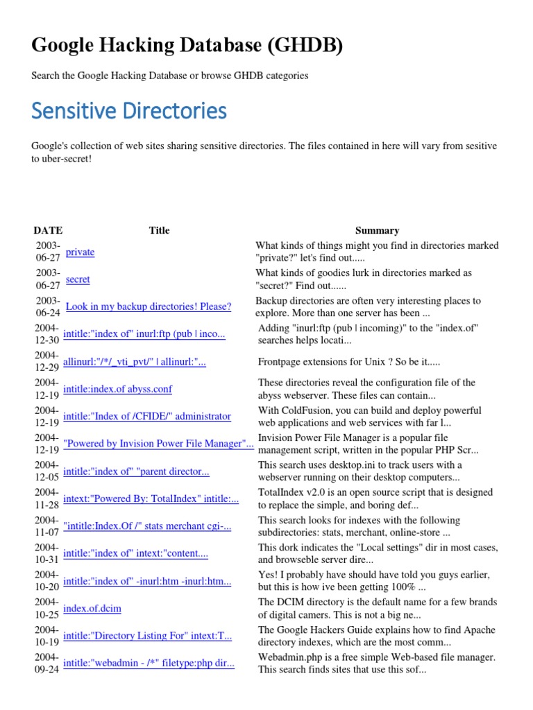 web dorking by google hacking database