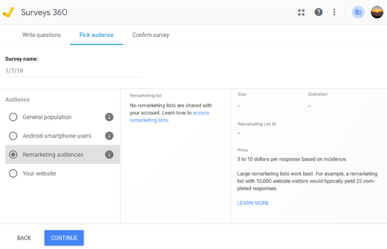 target remarketing lists in surveys 360